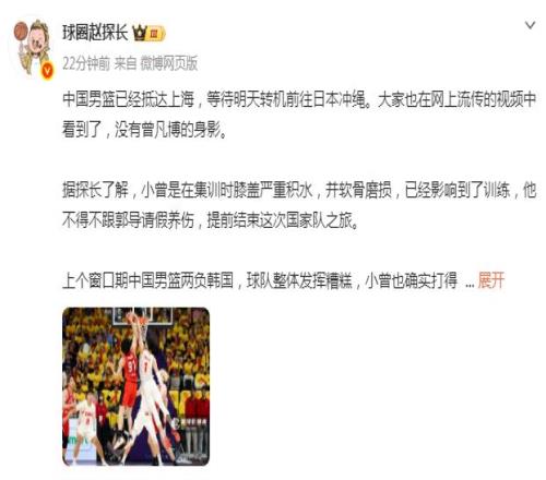 根据媒体人球圈赵探长报道:“曾凡博是在集训时,膝盖严重积水,并软骨磨损,已经影响到训练,他不得不跟郭士强指导请假养伤,提前结束这次国家队之旅。”