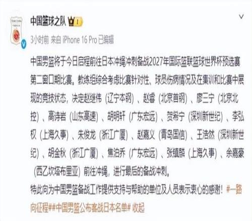 在CBA联赛的这个窗口期里,中国男篮要打两个世预赛客场比赛,对手分别是日本男篮和中国台北男篮。日前中国男篮已经飞往了日本冲绳,备战26日客场和日本男篮的比赛。中国男篮方面也进行了官宣,表示经过综合评估后,确定了出战这两场比赛的14人阵容,分别是:赵继伟、赵睿、廖三宁、高诗岩、胡明轩、贺希宁、李弘权、朱俊龙、赵嘉义、王浩然、胡金秋、焦泊乔、张镇麟、余嘉豪。余嘉豪会直接从西班牙飞往日本,和中国男篮会合。