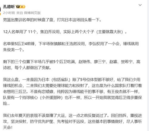 一来是日本队除了5号位体型外都不够好,给了我们少用锋线的机会;二来我们太需要处理球能力和投射了,这也是为什么国家队打着打着就老想用三号位,不是有恋矮癖,纯粹是因为锋线能干的事不够,有王俊杰就不一样,队里有一个持球核心(小外援那种)也不一样,我们去年夏天的表现不该是撞了大运,这一点之前反复说过了。回归挡拆,重视进攻,坚决投射,防守优先护筐、先考验对手远投,这些基本的事情做好,尽人事听天命!