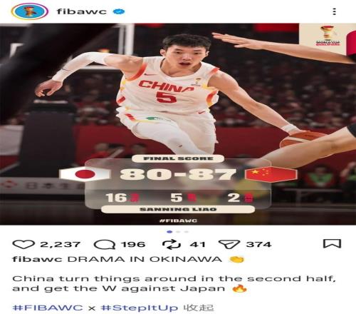 赛后,国际篮球联合会(FIBA)世界杯的官方账号写道:“冲绳神剧本!中国男篮从日本偷走一场胜利。”(China with a sneaky win over Japan),“Sneaky”一词隐含“鬼祟、卑鄙”的贬义,被质疑暗指中国队胜之不武。