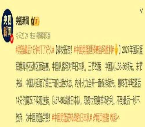 一场14分大逆转的关键胜利,不仅中国男篮全体队员们都兴奋不已,甚至有些队员喜极而泣,而且人民日报和央视新闻也都在第一时间发文,祝贺中国男篮得来不易的世预赛首胜,纷纷为这支不畏困难,无比顽强的队伍点赞!这就叫排面啊!是不是?