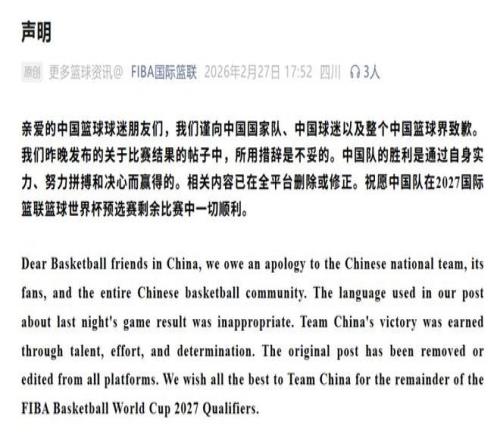 2月27日,国际篮联终于正式发声,向中国国家队、中国球迷以及整个中国篮球界表达歉意。声明中明确表示,此前发布的关于比赛结果的帖子所用措辞不妥,强调中国队的胜利是通过自身实力、努力拼搏和决心赢得的,相关争议内容已在全平台删除或修正,同时祝愿中国队在2027国际篮联篮球世界杯预选赛剩余比赛中一切顺利。这份道歉声明终于回应了公众的诉求,也暂时平息了因措辞不当引发的舆论风波,但此次事件留下的影响仍在持续,不少球迷希望国际篮联能真正秉持公平公正的原则,在后续赛事中规范自身行为,尊重每一支球队的努力。