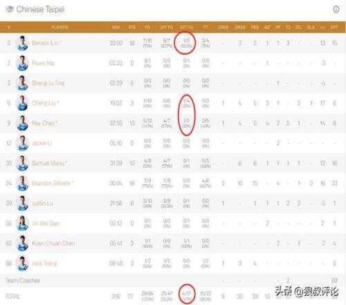 CBA三将方面,林庭谦是目前状态最好,对阵韩国的比赛,登场33分钟,10中7得到18分3篮板3助攻,陈盈骏12中5,得到13分5篮板4助攻。