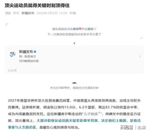 这篇文章的题目是《顶尖运动员就得关键时刻顶得住》,官媒盛赞来自新疆库尔勒的“儿子娃娃”胡金秋,用硬仗中的稳定实力证明,在顶尖赛场上,大部分职业运动员的天赋差距微乎其微,决定他们上限的是看待事业与人生的态度,是藏在心底的感恩与担当。