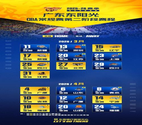 3月11日、13日球队将先后在客场挑战新疆、深圳男篮,3月15日(周日),将迎来第二阶段主场揭幕战,迎战老对手辽宁男篮。让我们一起为华南虎加油!