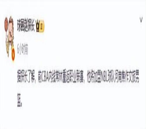 CBA联赛已经在前几天确定了27-28赛季恢复升降级的具体方案,不少NBL球队都开始对阵容进行补强。在合肥狂风签下了广东男篮旧将王薪凯后,河南焦作文旅也签下了北京男篮旧将常林,媒体人“球圈赵探长”在社交媒体上透露了这个消息。