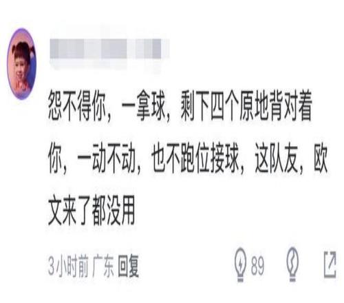 王思雨一拿球,剩下四个队友基本上都是原地背对着自己,球迷也感慨道:“怨不得你,这队友,欧文来了都没用。”