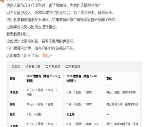 随着当年那一代女篮核心班底的年龄增长,新一代阵容中没有一个出色的控球后卫,中国女篮的四大中锋有三个未能展现风采,张子宇一人20+11实属杯水车薪,最关键的是张子宇只要登场对手的三分就能不断命中,她移动实在是太慢。
