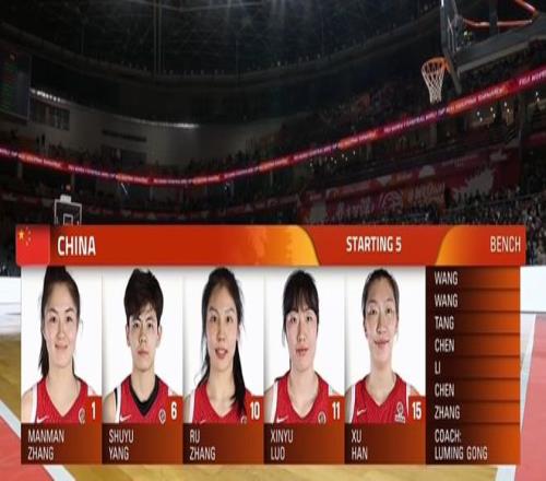 中国女篮首发:张曼曼、杨舒予、张茹、罗欣棫、韩旭。