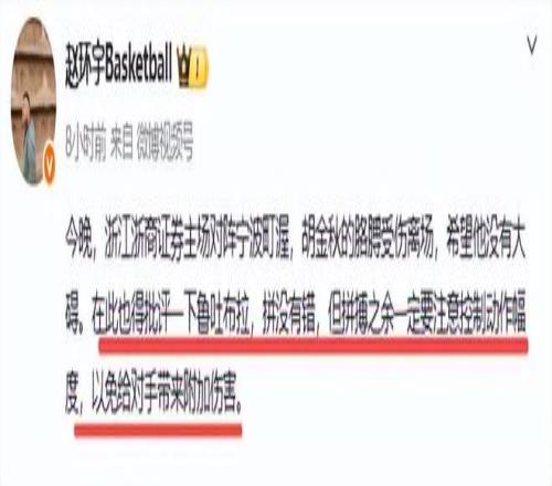 记者赵环宇也怒批鲁吐布拉,“浙江浙商证券主场对阵宁波町渥,胡金秋的胳膊受伤离场,希望他没有大碍。在此也得批评鲁吐布拉,“拼没有错,但拼搏之余一定要注意控制动作幅度,以免给对手带来附加伤害。”