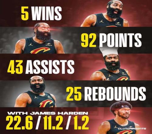 哈登时代才刚打5场,骑士就拿下5场胜利。哈登现在状态简直疯了,作为顶级指挥官掌控全场,正是骑士迫切需要的那种大脑。这5场胜利,哈登一共得到92分43助攻25篮板,场均数据是18.4分8.6助攻5.0篮板,投篮命中率49.1%,三分命中率48.1%。