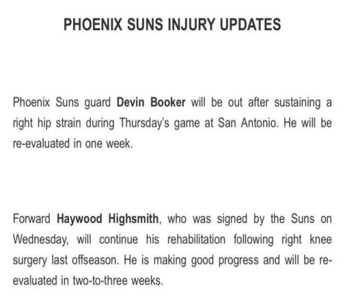 布克是在周五输给马刺的比赛中受伤的。这位29岁的得分后卫在首节中途返回更衣室,第二节末段曾尝试复出,但最终还是被确定下半场无法出战。