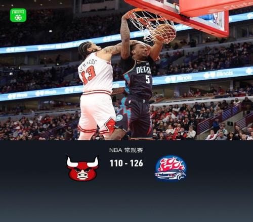 第四节公牛亚布塞莱拿下10分,活塞邓肯-罗宾逊拿下9分,最终公牛110-126不敌活塞