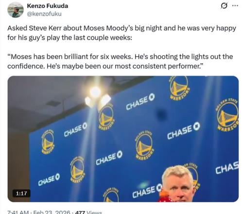 除了霍福德之外,另外一名首发穆迪也交出神奇表现,全场16中9,三分9中4,拿下23分7板5助1抢断,在四大核心缺席的情况下,继续扮演最稳定的得分点。