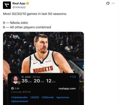 全场约基奇出战36分钟,21中11,三分4中3,拿下35分20板12助超级大三双,外加3断2帽,这是其生涯第9次单场至少拿下30分20板10助,断层高居NBA近50年历史第一,过去50年其他球员合计6次交出这一表现。