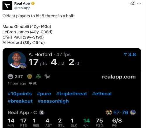 并且霍福德早早就进入比赛状态,半场三分6中5砍下赛季新高的17分,让39岁264天的霍福德成为NBA历史上半场命中至少5记三分第4老的球员。