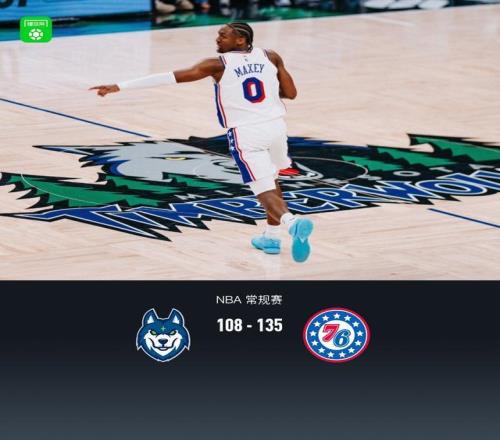第四节森林狼爱德华兹拿下5分,76人乌布雷拿下7分,最终森林狼108-135不敌76人