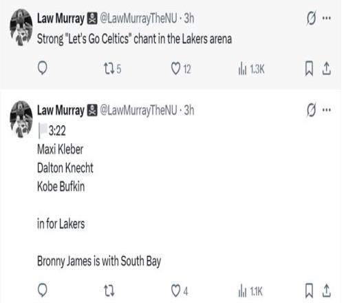 赛后记者Law Murray曝出,在比赛失去悬念后,湖人主场响起了“凯尔特人加油”的呼声以表达对主队表现的不满。