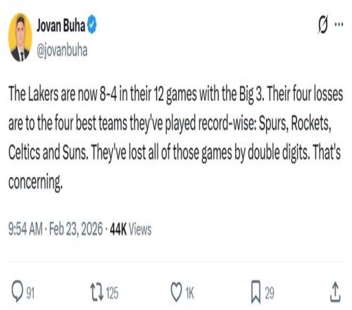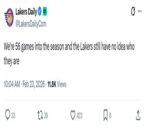 湖人媒体PurpGolded更是发文失望表示:“湖人这样的表现很难突破首轮。”