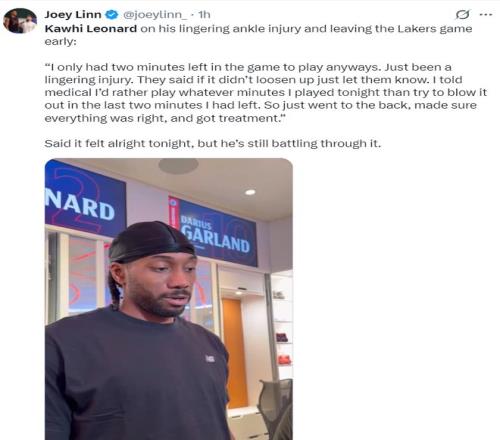 赛后伦纳德谈到了自己的脚踝伤病与登场时间限制的话题,他表示:因为我一直有伤在身,所以有些比赛有登场时间限制,我跟医疗团队说这场比赛能打多少分钟就打多少分钟,对阵湖人最后几分钟我经过检查后被强制留在替补席,今晚我的感觉还不错。