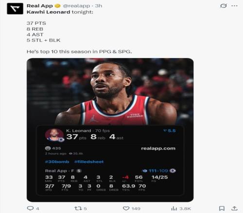 本赛季他得分、抢断、利用失误得分、罚球命中率、快攻得分都是联盟前十的存在,34岁的伦纳德真的进入巅峰期了。