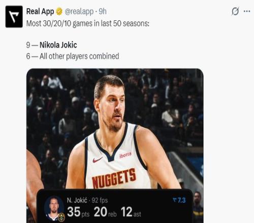 7.过去50个赛季约基奇9次30+20+10,其余人6次;
