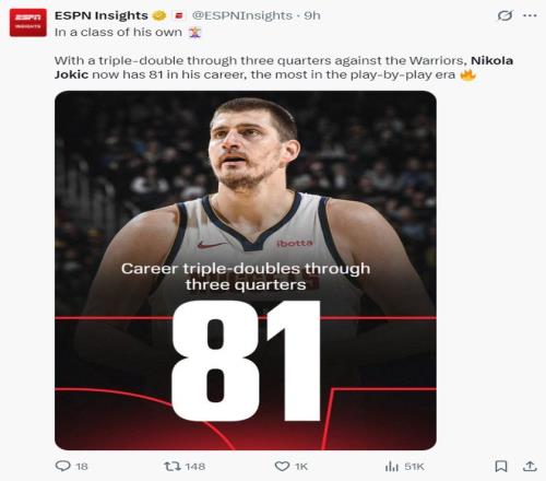 此役后约基奇再度创造多项纪录:1.生涯第81次前三节三双历史第一;