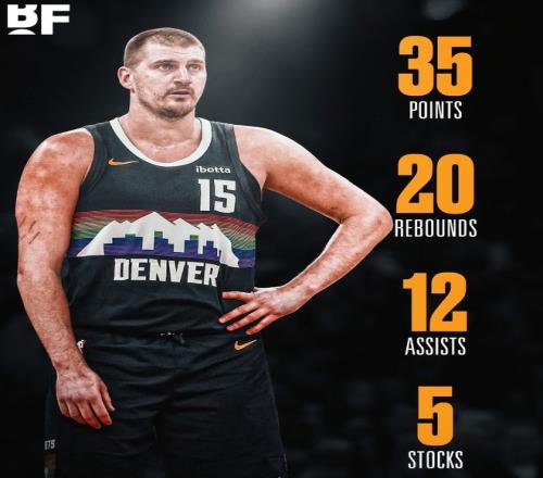 全场比赛约基奇36分钟,21中11,三分4中3,罚球11中10,拿到35分20篮板12助攻3抢断2盖帽,命中率52.4%,三分命中率75%,真实命中率67.7%,赛后不少掘金球迷觉得这场比赛有些假。