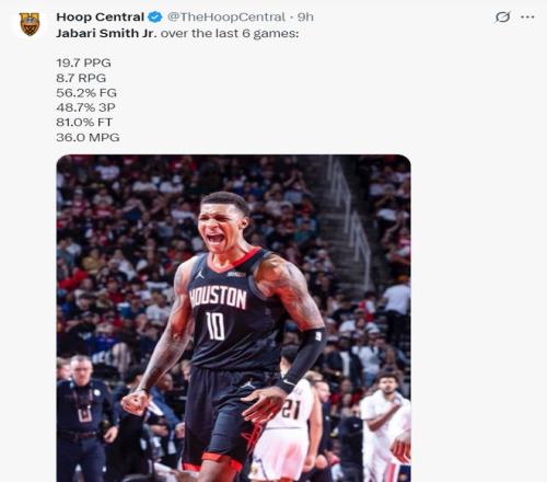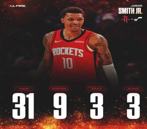 此役是小贾巴里-史密斯的表现是火箭最佳,全场比赛33分钟,17中12,三分11中6,罚球2中1,拿到31分9篮板3抢断3盖帽,命中率70.6%,三分命中率54.5%,真实命中率69.2%,正负值+28。