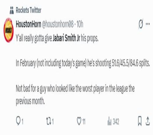 休媒:二月份小贾巴里-史密斯,投篮命中率51.6%,三分命中率45.5%,罚球命中率84.6%,他一月份还被认为是最差的家伙,不得不说他有了巨大的进步。
