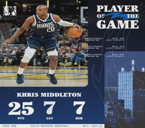 目前为止,米德尔顿已为独行侠出战五场比赛首发3次,场均上阵23分钟贡献14分4.8板2.6助,三项命中率49%、35.3%和88.9%。