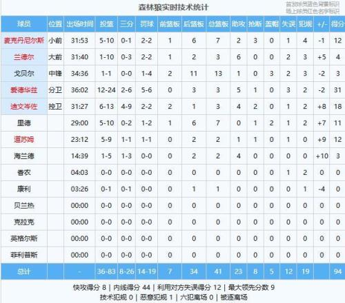 森林狼:爱德华兹31分3板5助、迪文岑佐18分3板4助2断、麦克丹尼尔斯12分7板2助3断、道苏姆12分2板1助、里德11分7板2帽、兰德尔4分3板6助、戈贝尔3分13板1助3帽