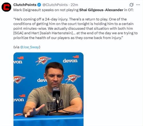 北京时间2月28日,NBA常规赛,雷霆127-121逆转掘金,这场比赛亚历山大伤愈复出,他休息了足足9场比赛,掘金一度领先雷霆16分之多,可雷霆在下半场开始猛烈反击,末节两队都手握绝杀机会只可惜都未能命中,加时赛掘金的小哈达威连续失误坑苦约基奇、穆雷。