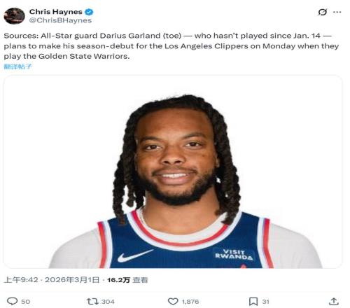 据名记Chris Haynes报道,达里厄斯·加兰将在3月3日对阵勇士的比赛中迎来快船生涯首秀。过去一个半月,他一直在处理脚趾伤势,交易截止日被送到快船后,一场没打。