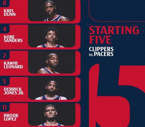 首发阵容方面,快船队这边,科林斯因伤缺战,主帅泰伦卢排出的最新首发五人组为:克里斯-邓恩、小德里克-琼斯、科怀-伦纳德、科比-桑德斯、布鲁克-洛佩斯;步行者队这边,哈利伯顿早已赛季报销,祖巴茨也不打,首发阵容为:内姆布哈德、内史密斯、沃克、西亚卡姆、杰-胡夫。