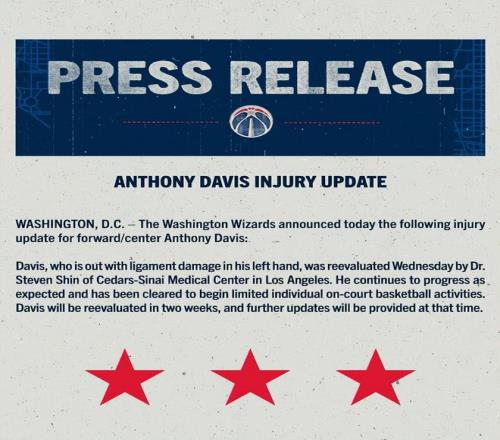 北京时间3月6日,奇才队官方宣布,球队内线核心安东尼-戴维斯自1月9日因左手韧带损伤缺阵后,于周四在洛杉矶接受了复查,恢复进程持续向好。据奇才队消息,戴维斯已获准开始进行有限的个人场上篮球训练。球队计划两周后再次对他进行评估,并届时公布最新情况。这意味着戴维斯至少再缺席两周的比赛。