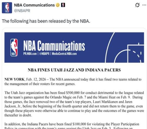 在全明星周末即将开打之际,NBA官方突然宣布重磅罚单,爵士与步行者因比赛阵容管理问题被处罚,其中爵士被罚50万美元,步行者被罚10万美元。