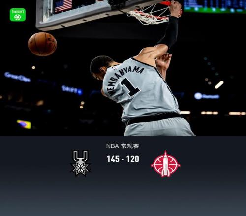 第四节马刺福克斯拿下7分,火箭小贾巴里-史密斯拿下9分,最终马刺145-120战胜火箭