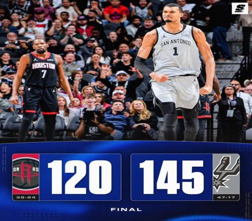马刺连续远投不进,杜兰特上篮得分,申京封盖福克斯,福克斯命中三分球还以颜色。距离终场还剩4分13秒,火箭落后20分,乌度卡换下全部首发,选择提前弃子认负,比赛就此失去了悬念。霍勒迪中远距离连续不进,哈珀上篮得手,杰夫格林2罚全中,马刺换上板凳席末端的球队,两队在场上练兵,时间逐渐走完。最终,马刺以145比120完胜火箭,就此取得了3连胜。休斯顿排名从西部第3跌至第4,被森林狼反超。数据显示,145分也创造了火箭本赛季的单场失分纪录,此前仅为133分。