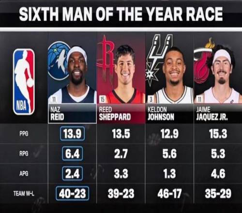 本赛季,火箭队的谢泼德场均可以贡献13.5分2.7篮板3.3助攻。前62场比赛,火箭队拿到了39胜23负的战绩,位居西部第3位。另一位是森林狼队的第6人纳兹里德,他本赛季场均可以贡献14+6+2的数据。另外就是马刺队的锋卫摇摆人凯尔登约翰逊,本赛季他场均可以贡献13+5+1的数据,而热火队的替补前锋小海梅哈克斯,本赛季场均可以贡献15+5+4的数据。