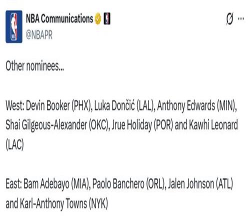 西部:德文-布克(太阳)、卢卡-东契奇(湖人)、安东尼-爱德华兹(森林狼)、亚历山大(雷霆)、朱-霍勒迪(开拓者)、科怀-莱昂纳德(快船)