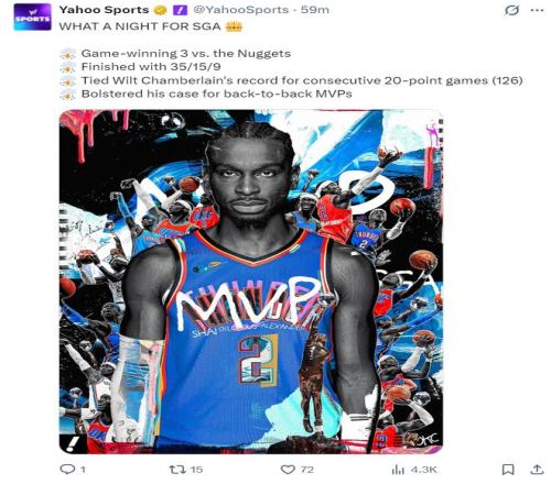 赛后雅虎体育盛赞SGA,他不仅连续126场拿到20+,他还命中了绝杀三分,他已经准备好蝉联MVP了。