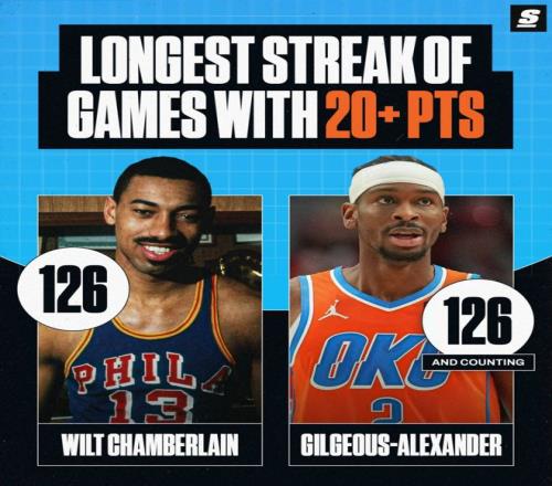 1.SGA连续126场比赛拿到20+刷新生涯新高;