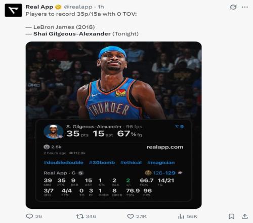 这场比赛亚历山大39分钟,21中14,三分球7中3,罚球4中4,拿到35分15助攻9篮板1抢断1盖帽0失误,命中率66.7%,三分命中率42.9%,他还一战创造多项纪录。