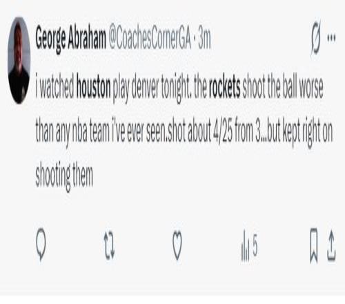 这场比赛火箭的惨败让很多记者、媒体对这支球队的前途产生了质疑,美记:我全程观看了这场比赛,火箭的投篮表现是我见过任何一支NBA球队最差的,他们三分球25中4后还在不停出手三分打铁。
