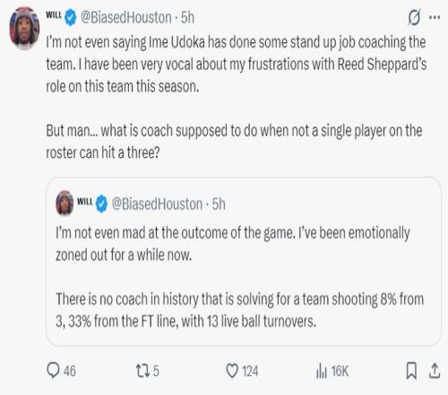 休媒:火箭球员在比赛中毫无乐趣可言,这才是他们面临的主要问题之一。