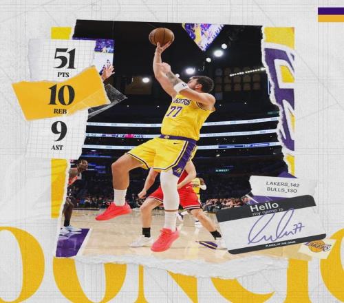 东契奇出战37分钟,投篮31中17,三分14中9,罚球9中8,狂轰51分10板9助3断1帽1失误,正负值+16。这是东契奇NBA生涯第8次50+,也是他在湖人的首次50+!东契奇罚球时,湖人球迷高喊:“东契奇,快拿个84分啊。”