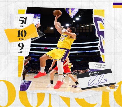 迪林厄姆上篮得手,奥尔布里奇高位跳投取分,布泽利斯抛投得手,东契奇2罚全中。迪林厄姆2罚1中,里夫斯篮下连进2球,米勒补篮取分,随后上篮打进。比赛时间走完,最终,湖人以142比130完胜公牛,拒绝了22分大逆转。