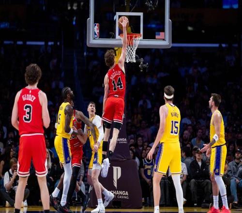 次节较量,里夫斯与河村勇辉对射三分球,詹姆斯失误,河村勇辉助攻布泽利斯暴扣。詹姆斯助攻艾顿扣篮,詹姆斯上篮不中,艾顿补篮取分,公牛请求暂停。詹姆斯跳投不进,艾顿2罚不中,布泽利斯外线取分。艾顿完成补扣,迪林厄姆、理查兹、特雷琼斯相继篮下得手,里夫斯单打命中为湖人止血。特雷琼斯抛投命中,里夫斯与迪林厄姆在中远距离斗法。