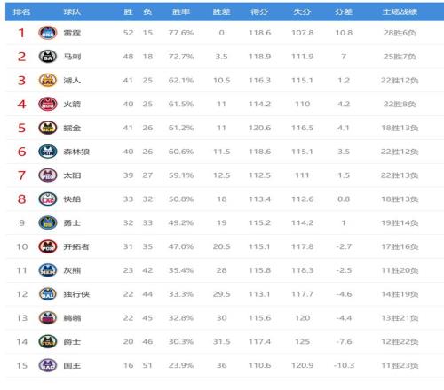 雷霆赢球后7连胜,战绩52胜15负,排名联盟第一。